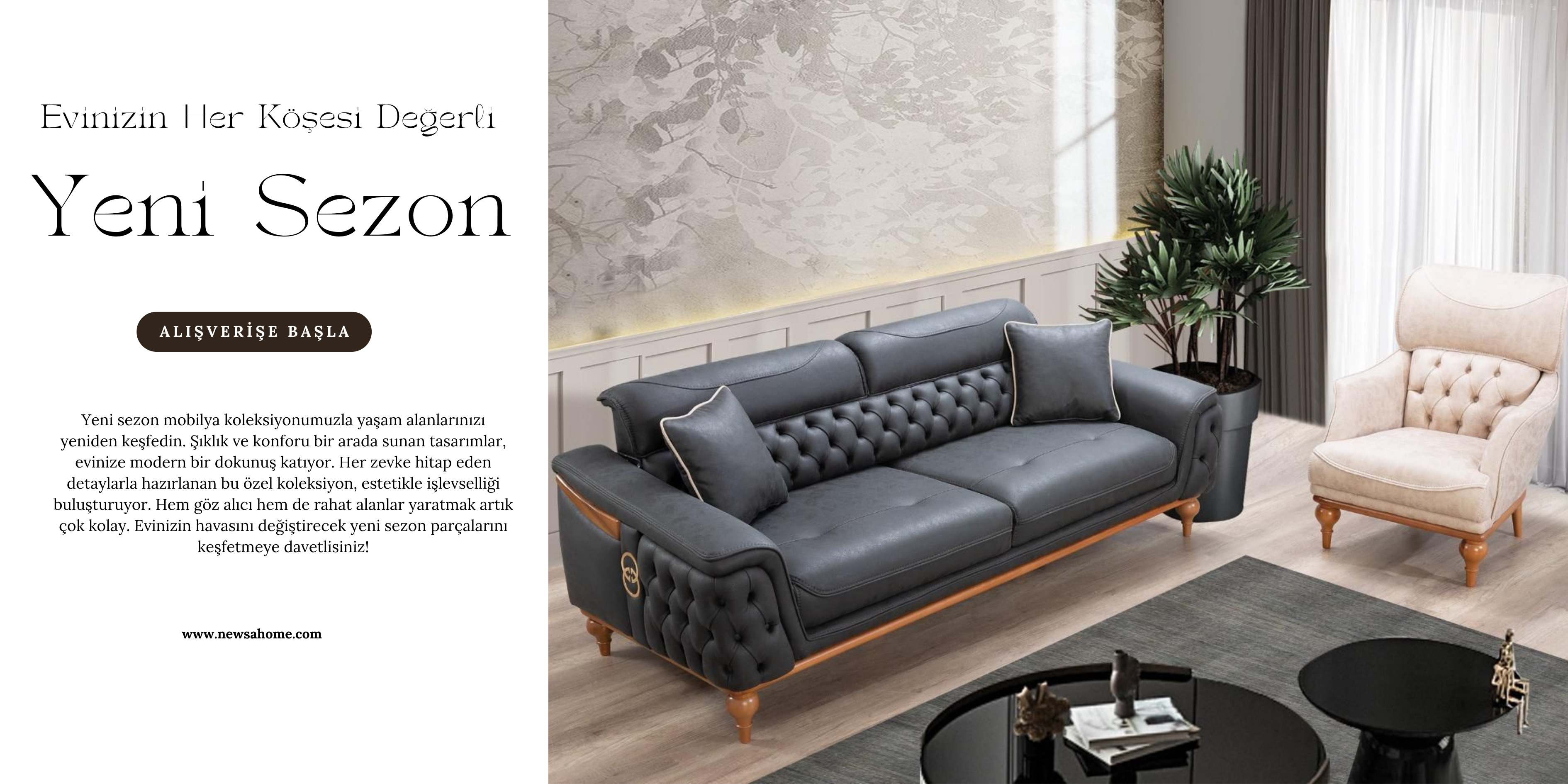Sizlere keyifli ve güvenilir bir alışveriş imkânı sunan newsahome.com’un web adresinde birbirinden şık ve modern yatak odaları, yeni tasarım yemek odaları, rahat ve konforlu koltuk takımları, köşe takımı, tv ünitesi gibi aradığınız tarz birçok ürüne uygun fiyatlarla ulaşabilirsiniz. Oluşturduğumuz düğün paketleri ile her tarza uygun düğün alışverişinizi gönül rahatlığı ile yapabilir, en avantajlı fiyatları Newsa Home’da bulabilirsiniz.